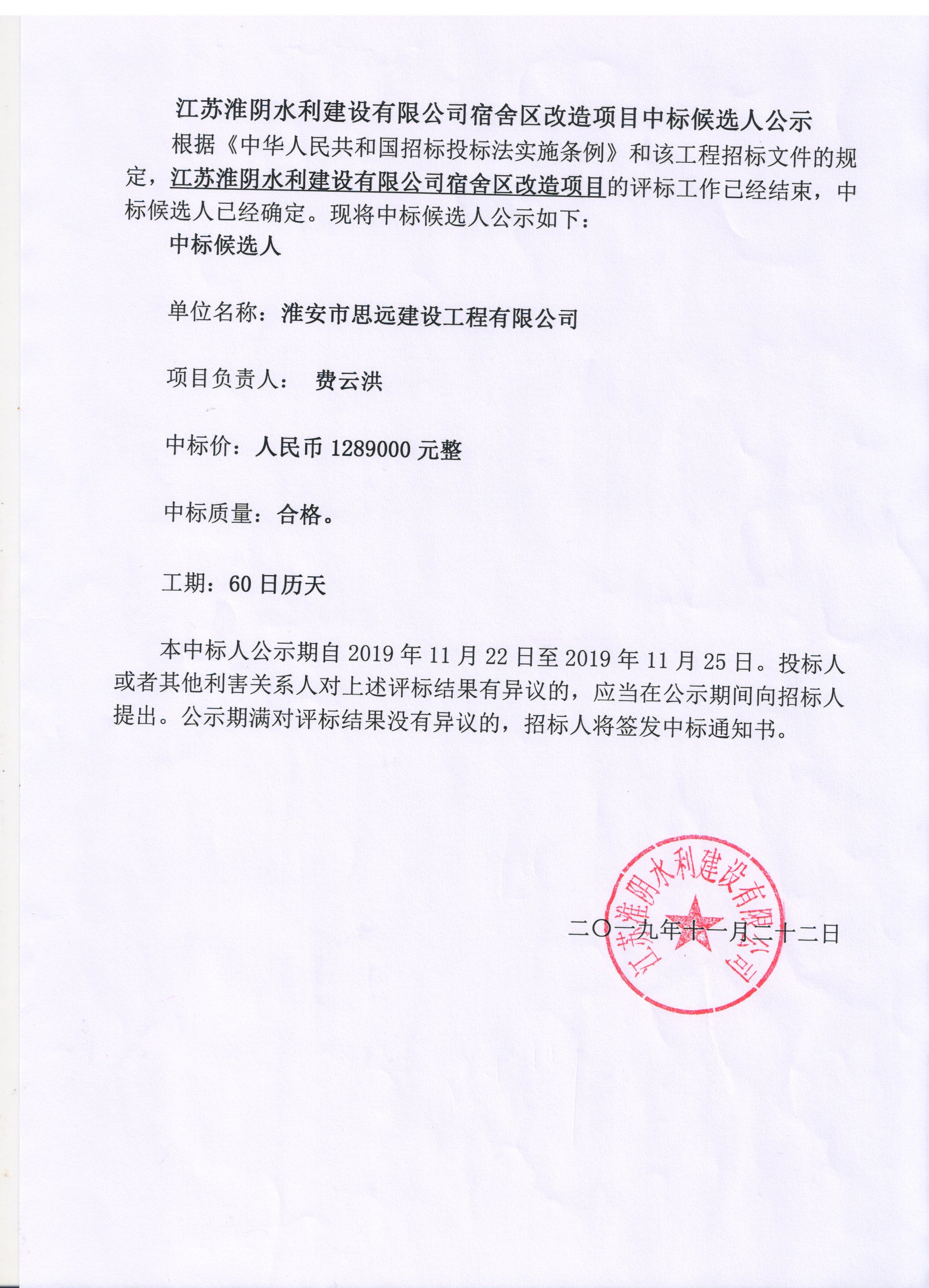 江蘇淮陰水利建設(shè)有限公司宿舍區(qū)改造項目中標候選人公示